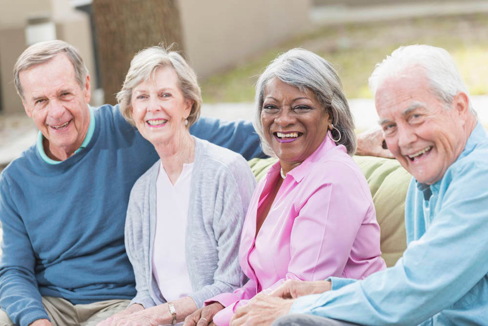 A group of senior men and women smiling as they sit together at a table